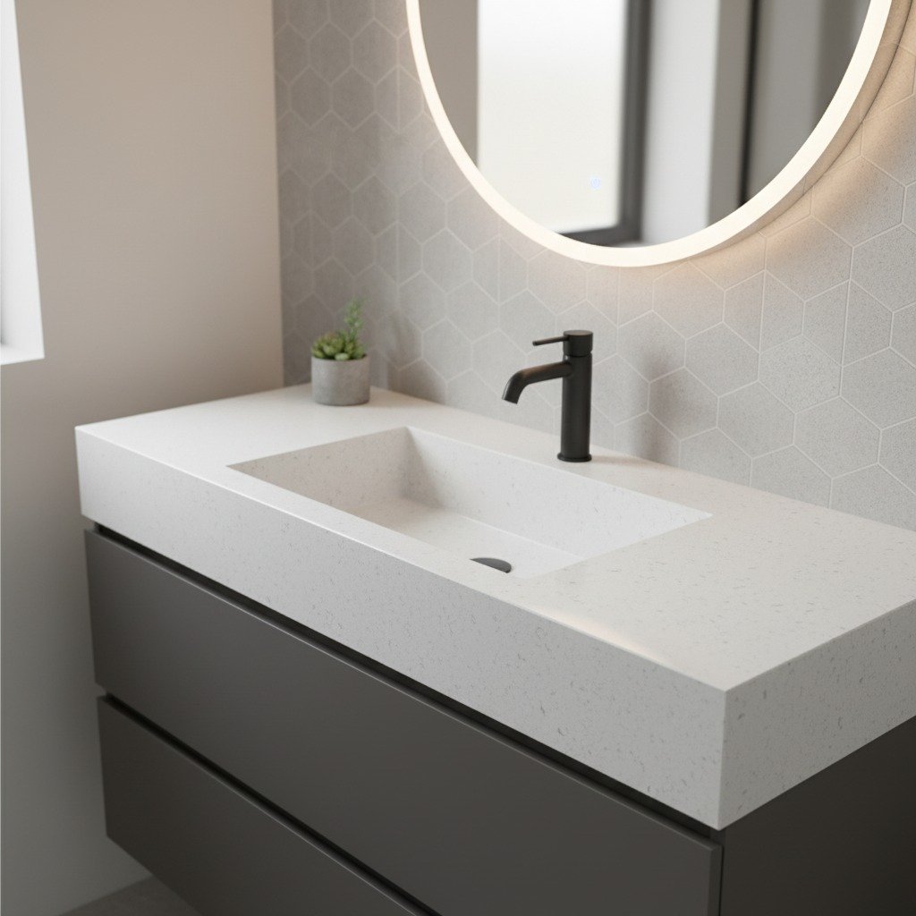 تصميم عصري يدمج الحوض بسلاسة في سطح الرخام، بلون موحد ومظهر أنيق.