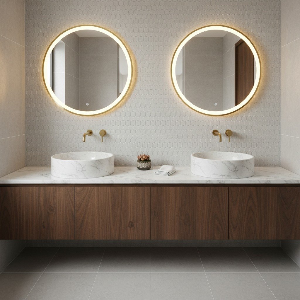 مثالي للحمامات الكبيرة، بتصميم موحد من الرخام الأبيض الفاخر مع لمسات ذهبية عصرية